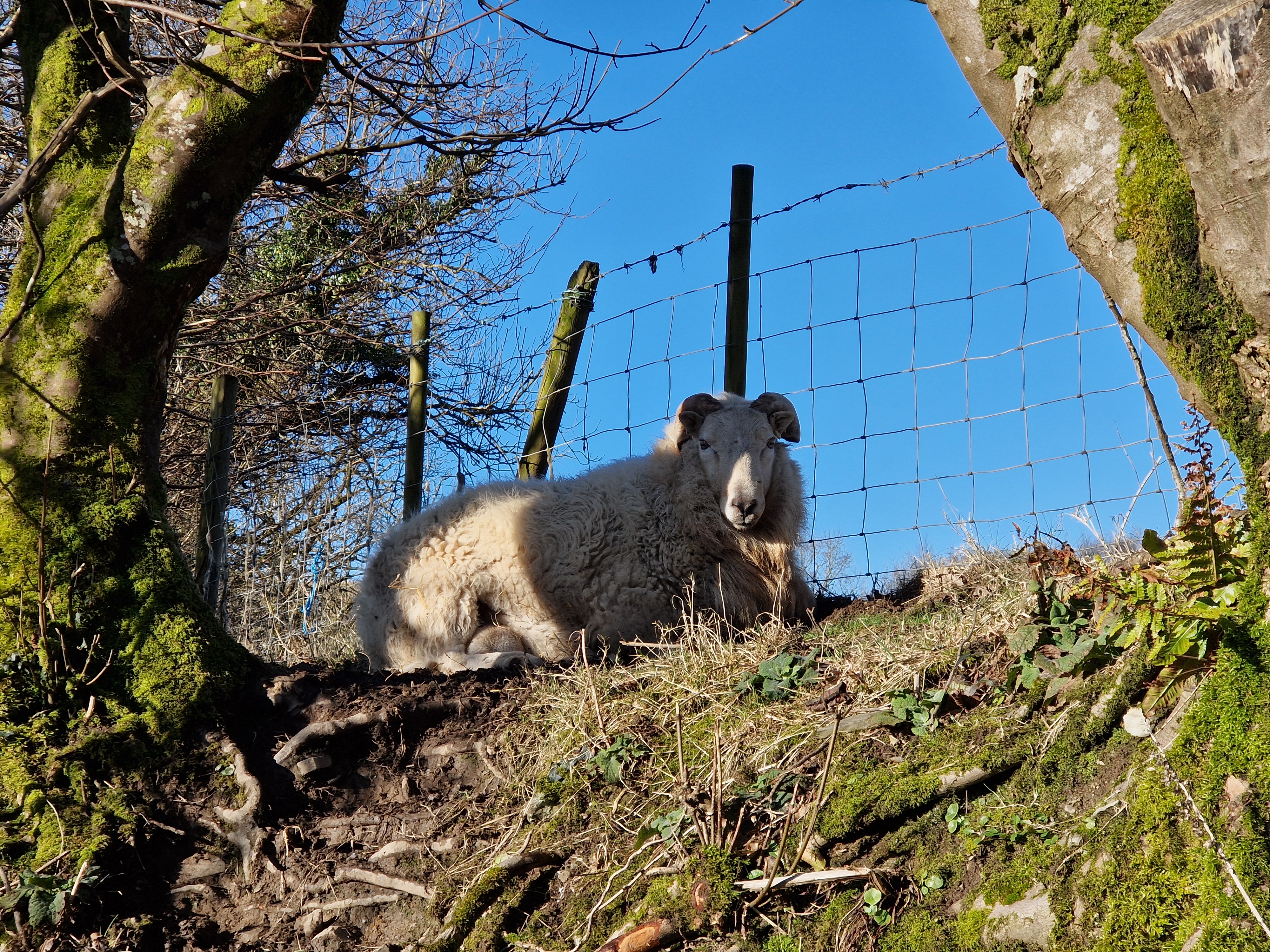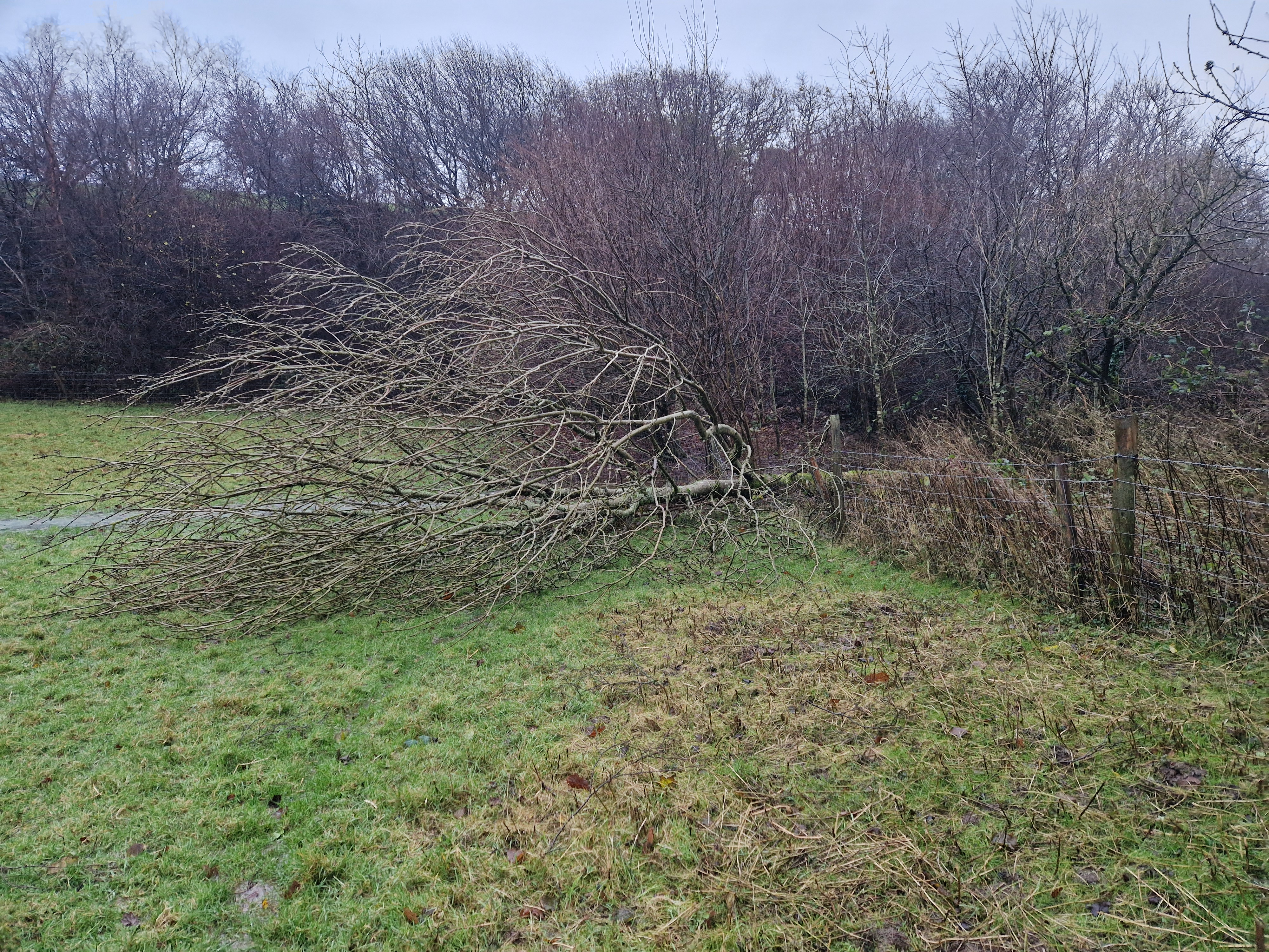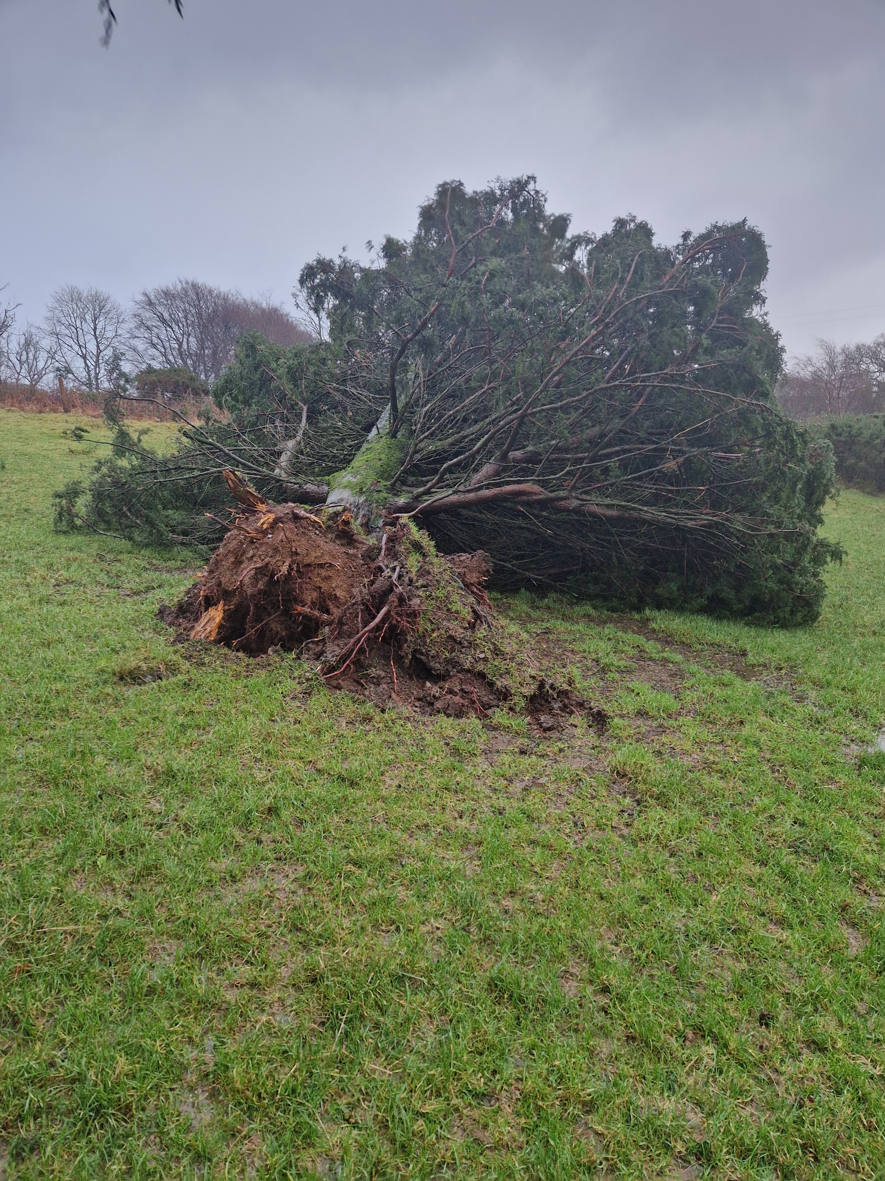 At the beginning of December we were hit full on by Storm Darragh. We endured 48 hours of 80mph winds with gusts of up to 115mph. All power, phones and internet were knocked out and we remained without power for 7 days. Thankfully the mobile phone signal returned after 4 days. It’s not nice feeling so cut off from the World. We had a red warning that a major storm was on our way, so all the sheep were brought down to areas where they had access to safe grazing and shed shelter. The older and more delicate sheep were already in at night time, so it was only the younger flock that needed to be brought down to the paddock shed. After 48 hours of what quite frankly felt like hell with howling wind and torrential rain, i was physically and mentally exhausted. We suffered huge damage with trees being blown down which resulted in many broken fences. The slate roof on the stone shed started to lift when the coping on the edge blew loose. I spent a good hour being constantly blown off a ladder, trying to secure the coping as i knew if that went, we’d lose the roof. Bale twine, 80mph winds and being up a ladder don’t really mix very well, but eventually i managed some sort of holding and then just prayed for the next 24 hours that it would all stay in place! Thankfully it did. Looking back on it now, i must admit i am fortunate in having a woodburner for heat, hot water and to cook on and my Nan’s old toasting fork came in very handy when making beans on toast. Childhood memories were rekindled of toast done the right way!! Another memory which makes me laugh….i came out of the shed with an empty bucket in my hand, the wind caught the bucket and lifted my up into the air like Mary Poppins and deposited me in the mud about 15 feet away. At least it was a soft landing!!! I can quite honestly say that was the worst storm i’ve ever experienced. It was truly scary. Thank goodness all the animals remained calm and safe.