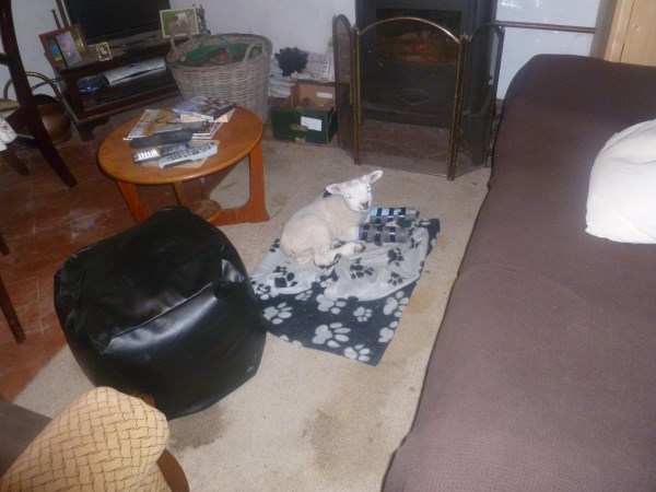 Apart from his bandy knees, he also had contracted tendons and was unable to straighten his legs from the pastern down so was knuckling over all the time. I strapped and splinted his legs and he spent the first 6 weeks wearing splints. Being a Texel, his daily weight gain was quite considerable and my one worry was that he would grow too quickly for his legs to ever strengthen and support him. He had to live in the house during the time he wore splints as he was unable to walk in the straw pen with the other bottle lambs. The straw caught in the splints and he kept falling over. He had his splints changed every 4 days so they didn’t get too tight for him as he grew.