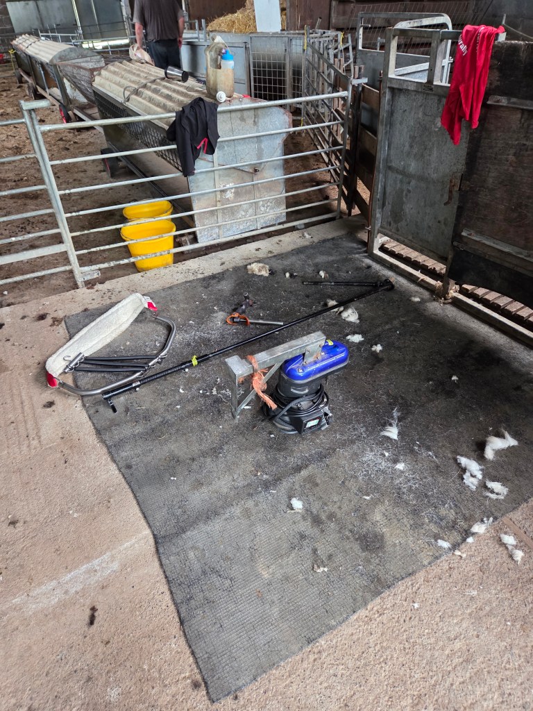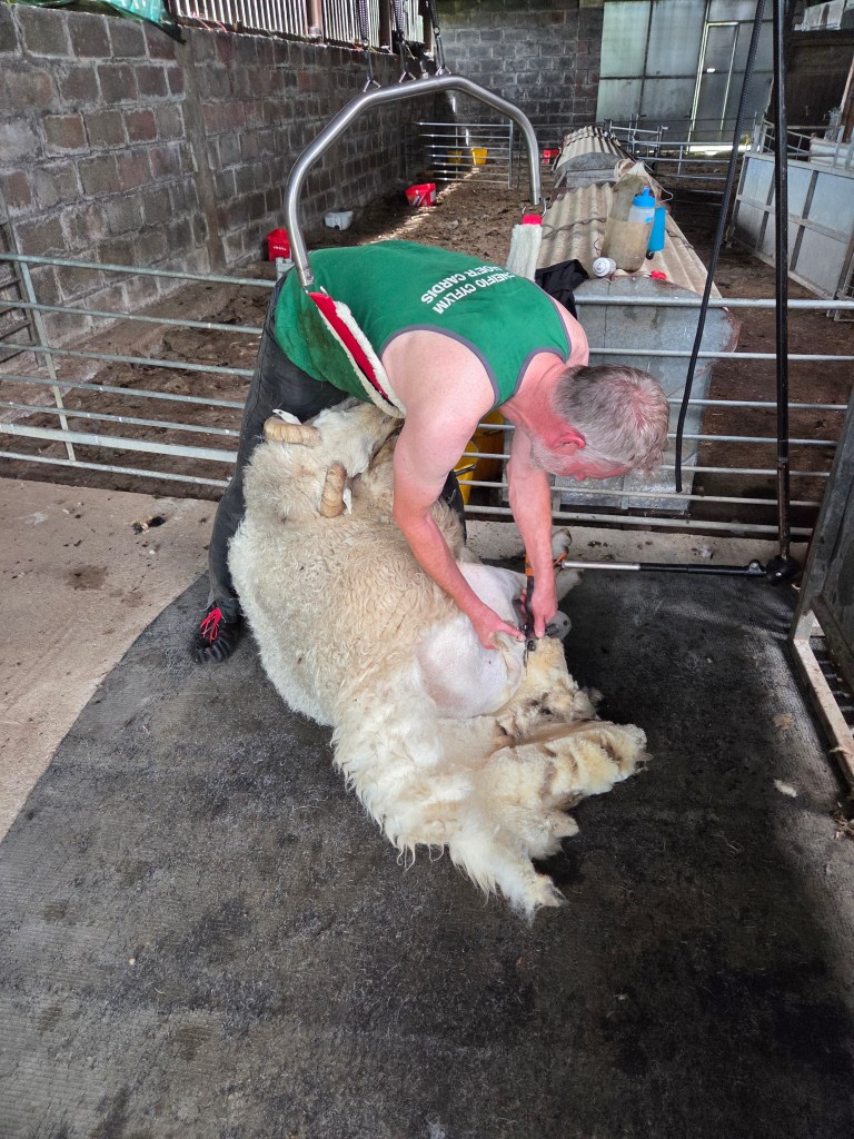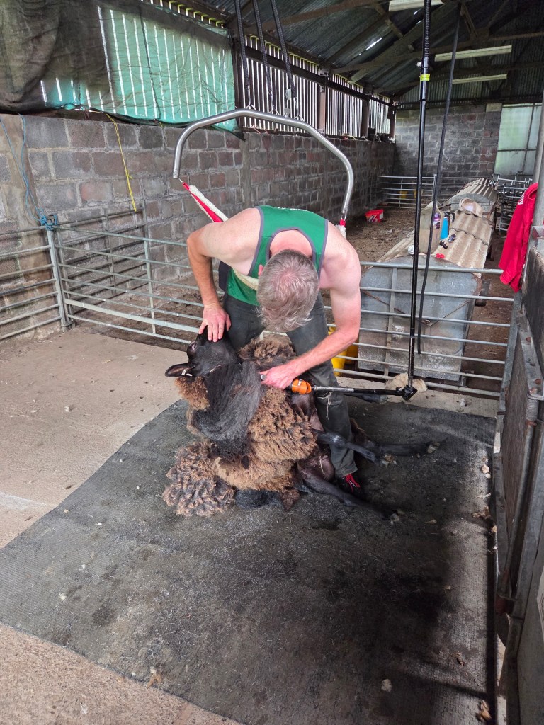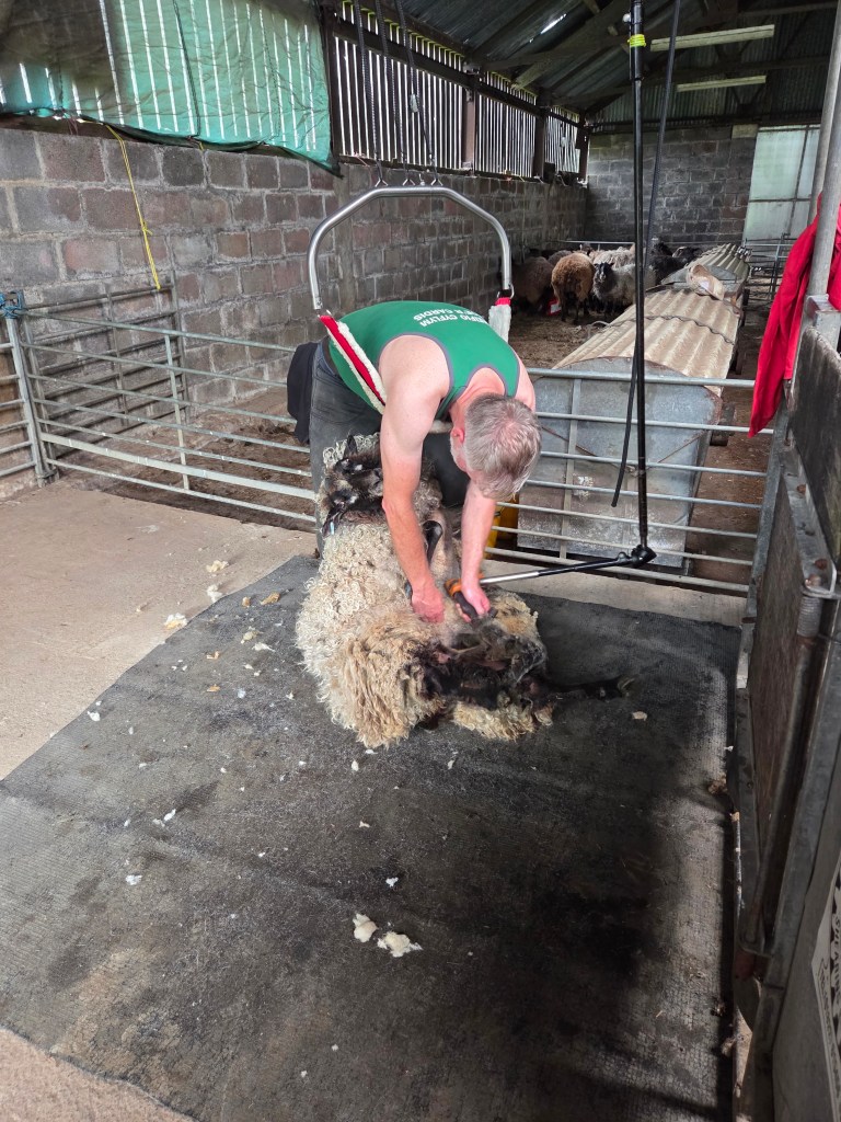 Once the weather picked up, i was keen to get the flock sheared, but the weather was still quite unpredictable and each time the shearer wanted to come, it was wet and so we had to be patient which is not one of my strong points. I decided to start shearing the old girls myself. I often do a few of the oldies as i don’t like them rolled around too much, so shear them standing up which doesn’t hurt their arthritic joints. I ended up doing a quarter of the flock as it suddenly turned very hot and one or two seemed to be suffering in the heat before Ned our shearer arrived to finish the rest on 20th June. Shearing day was a scorcher, 33*c in the shed. It would be fair to say we all dripped a bit!! It was all over in a couple of hours and the sheep were very happy to be relieved of their heavy fleeces.